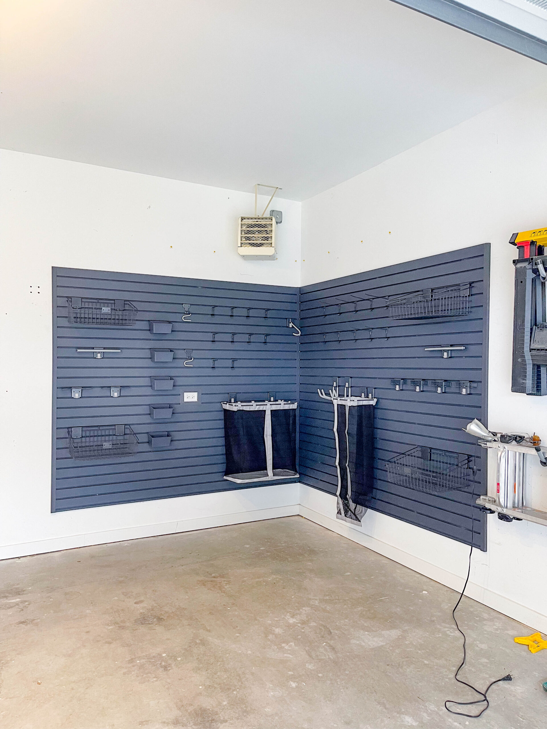 The Inspired Closets Team really knows how to maximize storage space. Katie, the designer, saw the chest freezer in the corner of the garage and recommended adding storage for coolers and picnic baskets above. She also suggested just the right combinations of storage bins, boxes, hooks, and hanging bags for the slat wall.