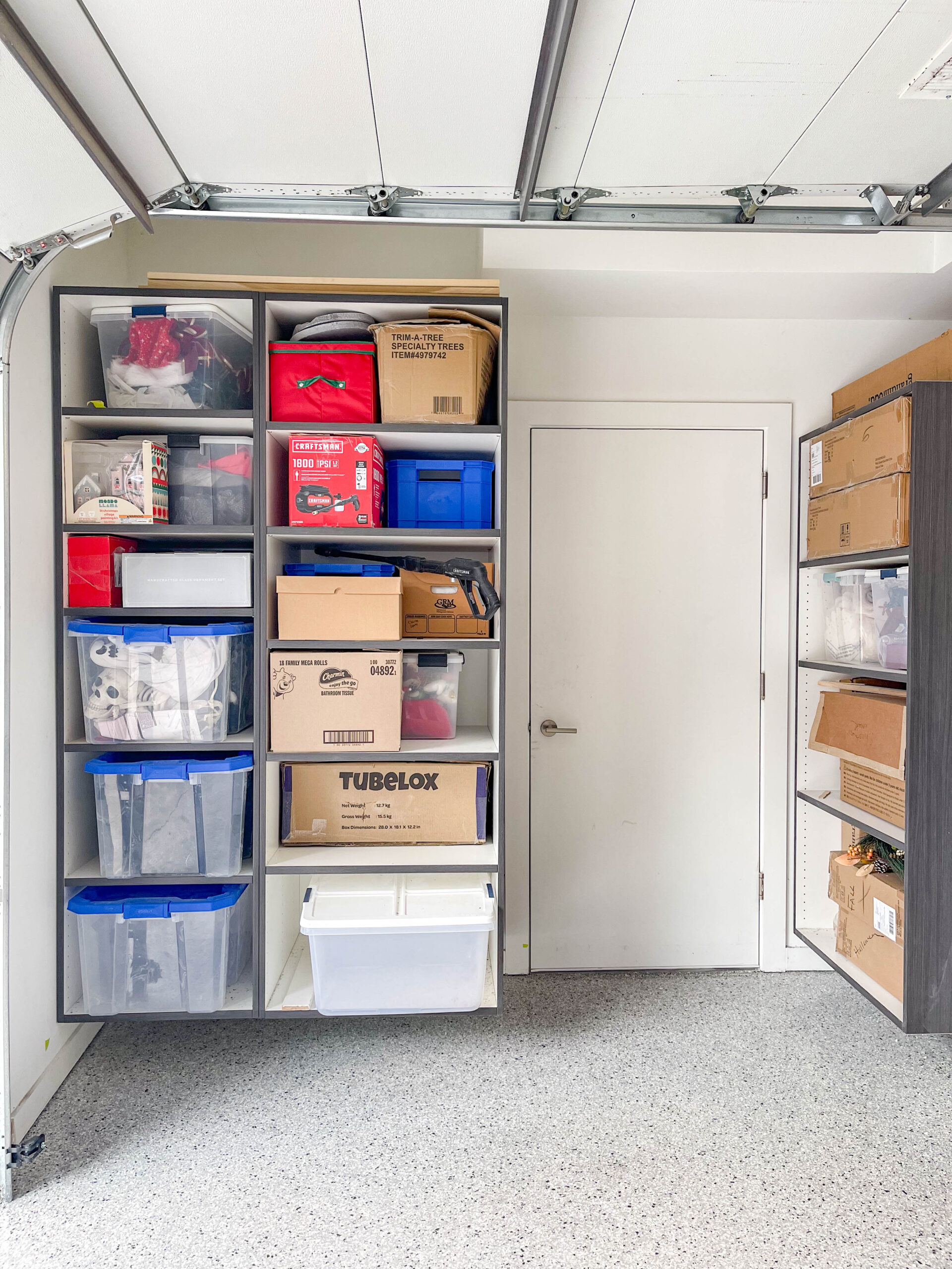 The number one item on my wish list was maximizing the storage corner of the garage. This little nook is next to the space where cars park. The goal was to add storage without reducing parking space. These shelving units are so much taller and deeper than what we had before. There is plenty of room for my questionably large collection of wreaths and all my holiday decor. Yes, one of the giant bins is solely dedicated to storing Halloween spiders.
